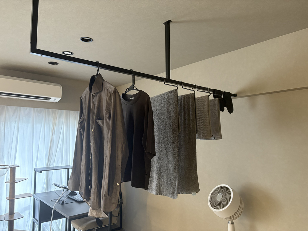 多くの人がリビングでの部屋干しを避けていく中、あえて設置したリビング物干し。